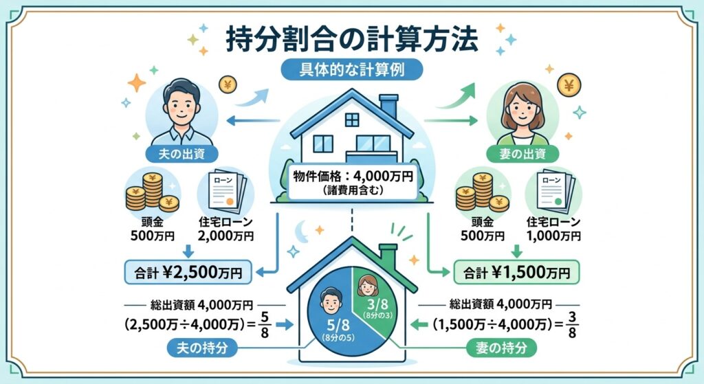 | 具体的な計算例 物件価格:4,000万円(諸費用含む) 夫の出資:頭金500万円 + 住宅ローン2,000万円 = 合計2,500万円 妻の出資:頭金500万円 + 住宅ローン1,000万円 = 合計1,500万円 → 夫の持分:8分の5(2,500÷4,000)、妻の持分:8分の3(1,500÷4,000) |