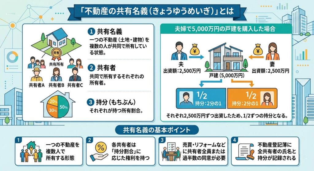 | 💡 共有名義の基本ポイント ・一つの不動産を複数人で所有する形態 ・各共有者は「持分割合」に応じた権利を持つ ・売買・リフォームなどには共有者全員または過半数の同意が必要 ・不動産登記簿に全共有者の氏名と持分が記録される |