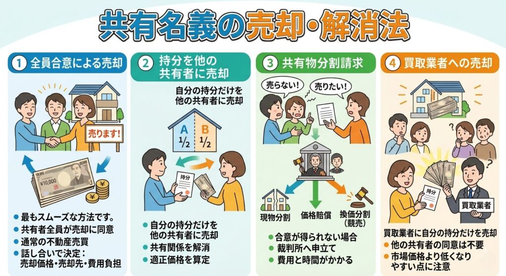 共有名義の不動産を売却または名義を解消する場合、いくつかの方法があります。