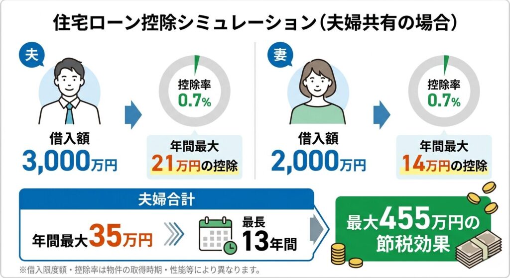 | 住宅ローン控除シミュレーション(夫婦共有の場合) 夫:借入額3,000万円 → 年間最大21万円の控除(0.7%×3,000万円) 妻:借入額2,000万円 → 年間最大14万円の控除(0.7%×2,000万円) 夫婦合計:年間最大35万円 × 最長13年間 = 最大455万円の節税効果 ※借入限度額・控除率は物件の取得時期・性能等により異なります。 |