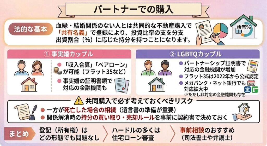 - パートナーとの共有:事実婚やLGBTQカップルでの購入ケース。