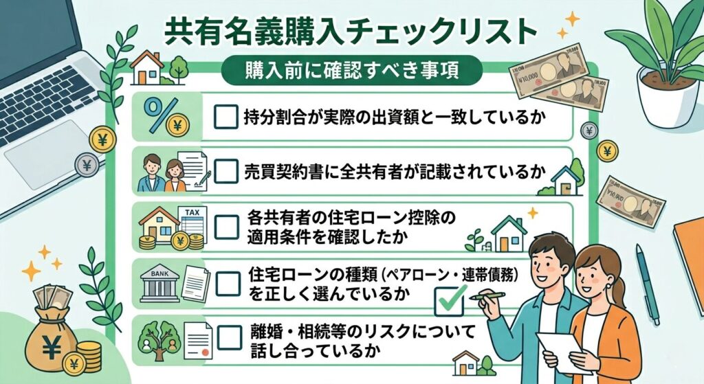 | 購入前に確認すべき事項 □ 持分割合が実際の出資額と一致しているか □ 売買契約書に全共有者が記載されているか □ 住宅ローンの種類(ペアローン・連帯債務)を正しく選んでいるか □ 離婚・相続等のリスクについて話し合っているか □ 各共有者の住宅ローン控除の適用条件を確認したか □ 税理士・司法書士に相談したか □ 登記完了後に登記内容を確認したか |