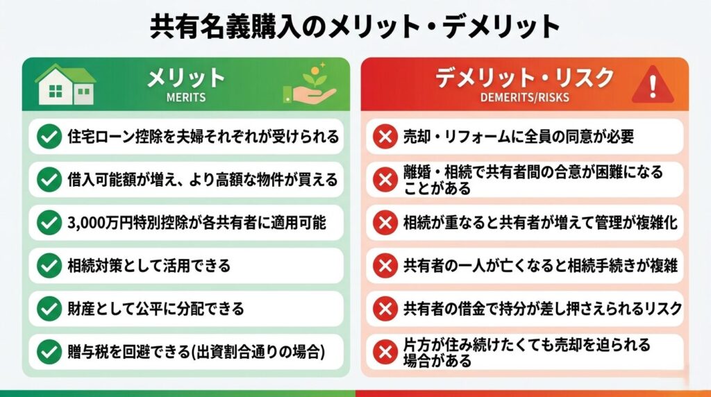 共有名義で不動産を購入することには大きなメリットがある一方で、将来的なリスクも伴います。