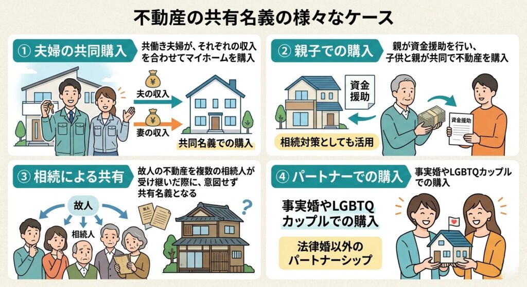 - 親子での共有:親が資金援助を行い、子供と親が共同で不動産を購入するケースです。相続対策としても活用されます。