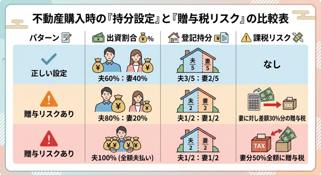 - 誤解①:夫婦だから半々でOK → 出資額が異なるのに半々にすると贈与税の対象になります。